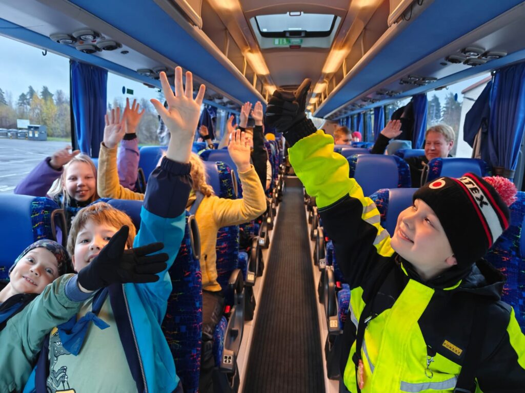 Innokkaita leiriläisiä aloittamassa bussimatkan Kiviniemeen. Aaluette kajahti mukavasti heti matkalla!